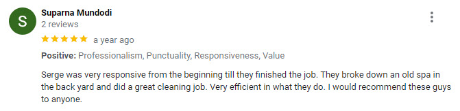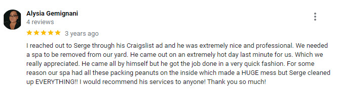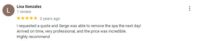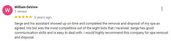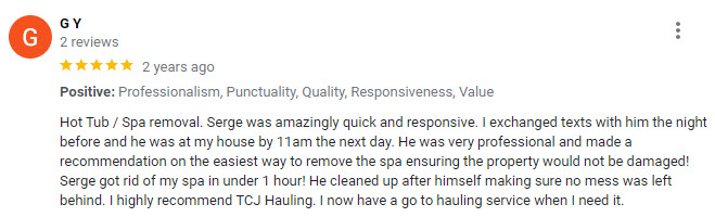At TCJ Hauling, we pride ourselves on our friendly and professional approach. Our team is dedicated to providing a positive customer experience, making the spa removal process easy and stress-free.